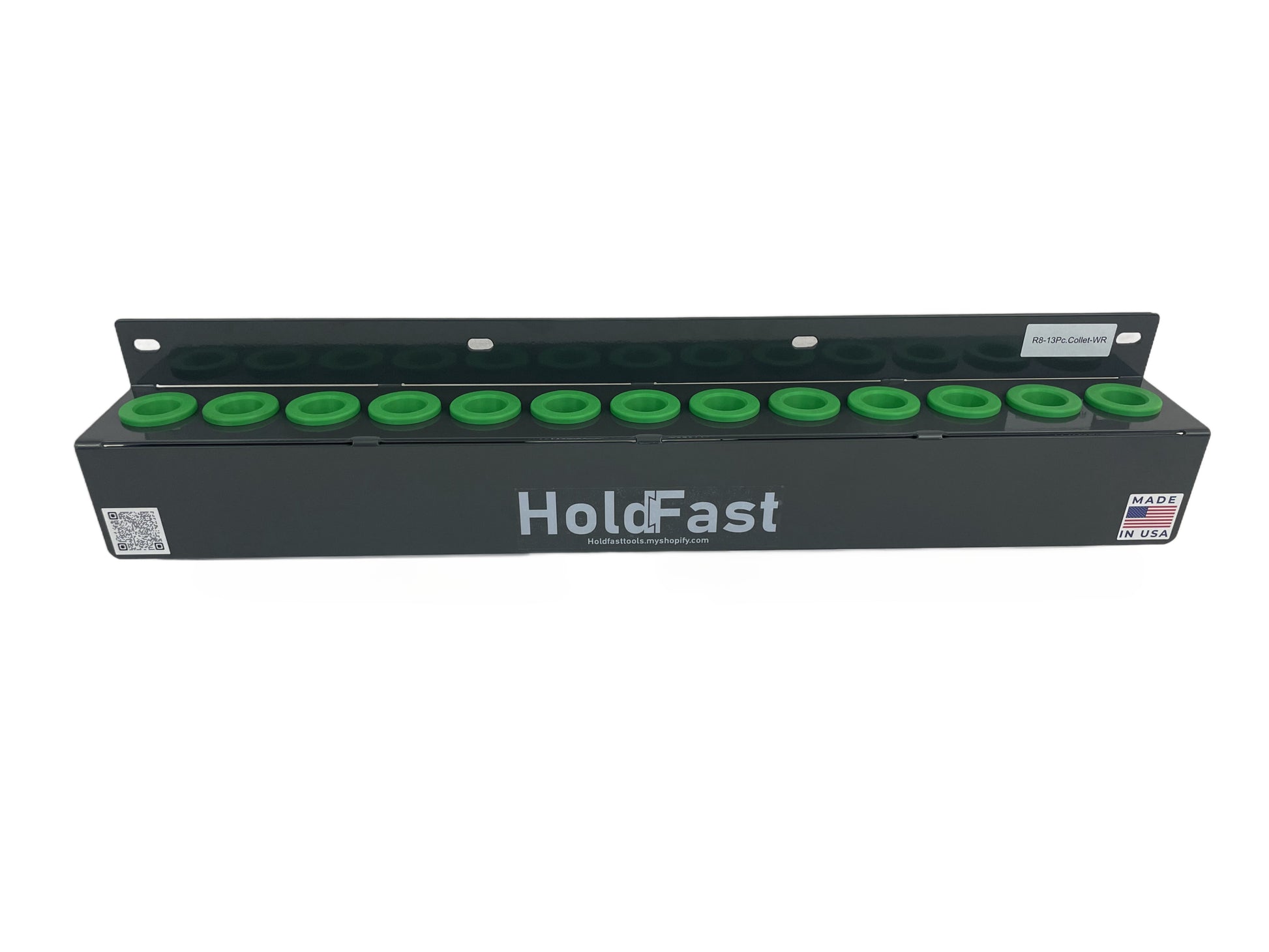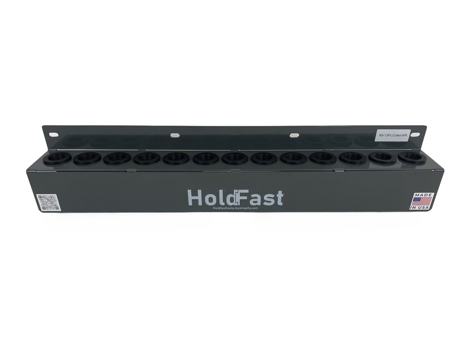 The R8/13Pc. Collet wall mount Tool Rack can hold a standard 13pc. R8 collet set. It is fabricated out of 12-gauge steel with an industrial powder coat finish. Tapered plastic sockets provide secure tool holding, and prevents any marring, scratching or potential damage to precision surfaces of tool tapers. Can be easily mounted to walls, and tool benches with 4x fasteners.